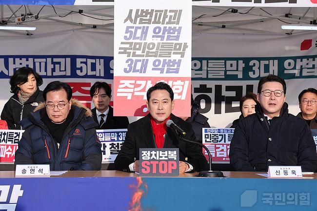 장동혁 국민의힘 당대표는 15일 서울 여의도 국회 본관 앞 ‘8대 악법 저지’ 릴레이 천막농성장에서 열린 최고위원회의에서 이재명 대통령의 최근 발언을 두고 “대통령의 말이 불안하면 국민의 삶도 불안해진다”며 권력 남용과 사회 질서 훼손을 강하게 비판했다.장동혁 당대표는 모두발언에서 “정치인의 힘은 말에서 나... -