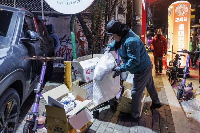 박강수 마포구청장이 레드로드 보도에 적치된 쓰레기와 킥보드를 치우고 있다.