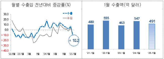 올해 1월 한국의 수출이 전년 동기 대비 10.2% 감소한 491억 달러를 기록하며 16개월 만에 감소세로 돌아섰다. 같은 기간 수입은 6.4% 감소한 510억 달러로 집계되며, 무역수지는 19억 달러 적자를 나타냈다. 이는 20개월 만에 적자로 전환된 것이다.