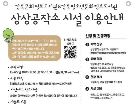 상상공작소는 4차 산업혁명 시대에 필요한 창의력과 혁신 역량을 키우는 기회를 지역 주민들에게 제공하기 위해 2021년 4월 강북문화정보도서관과 강북청소년문화정보도서관에 조성된 창의 공간이다.