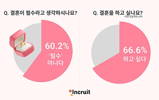 직장인 10명 중 6명은 결혼을 인생의 필수 요소로 여기지 않는 것으로 나타났다. HR테크 기업 인크루트가 직장인 653명을 대상으로 실시한 설문조사 결과, 60.2%가 결혼을 필수가 아니라고 응답했다.
