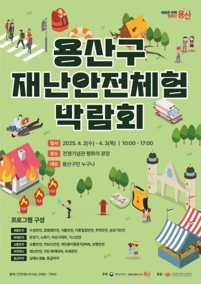 서울 용산구(구청장 박희영)가 오는 4월 2일부터 3일까지 전쟁기념관(용산구 이태원로 29) 평화의 광장에서 `2025년 용산구 재난안전체험 박람회`를 개최한다.