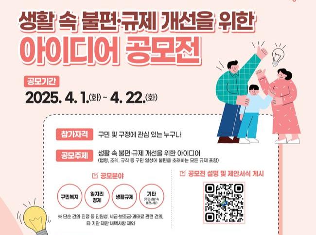 영등포구(구청장 최호권)가 구민의 일상 속 불편과 불필요한 규제를 개선하기 위해 ‘생활 속 불편‧규제 개선 아이디어 공모전’을 개최하고, 오는 4월 22일까지 제안을 모집한다고 8일 밝혔다.