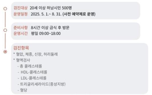 검사는 하남시보건소 1층 진료실에서 진행되며, 20세 이상 하남시민 500명을 대상으로 사전 예약을 통해 이뤄진다. 검진 항목은 총 9종으로 ▲총콜레스테롤 ▲HDL콜레스테롤 ▲LDL콜레스테롤 ▲트리글리세라이드 ▲혈당 ▲혈압 ▲체중 ▲신장 ▲허리둘레 등이며, 모든 항목은 무료로 제공된다.