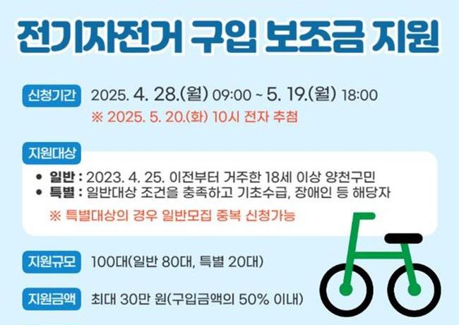 양천구(구청장 이기재)는 탄소배출이 없는 전기자전거가 자동차를 대체하는 생활형 교통수단으로 활용될 수 있도록 구민 100명에게 전기자전거 구입비를 1인당 최대 30만 원까지 지원한다고 28일 밝혔다.