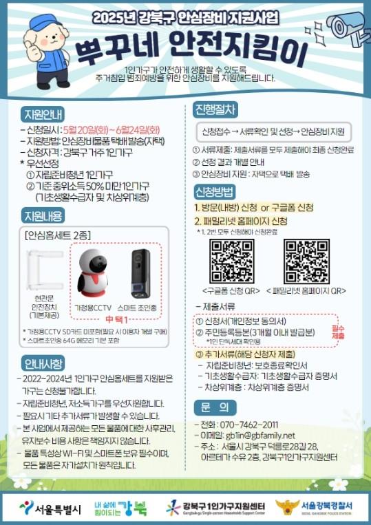 `뿌꾸네 안전지킴이`는 강북구 1인가구의 안전한 생활환경 조성을 목표로 범죄 예방에 효과적인 안심장비 2종을 무상 지원하는 사업이다. 신청자는 현관문 안전장치와 함께, 스마트 초인종 또는 가정용 CCTV 중 1종을 선택해 총 2종의 안심홈세트를 지원받을 수 있다.