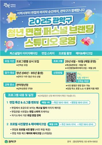 청년 면접 퍼스널브랜딩 스튜디오는 관악청년청(관악구 남부순환로 1759)에서 6월부터 10월까지 운영된다. 프로필 사진 촬영과 헤어 메이크업 지원은 주간(14시∼17시)과 야간(18시∼21시)으로 나누어 매월 2회 운영하고, 면접 특강(18시∼19시)과 소그룹 멘토링(19시∼21시)은 매월 1회 진행된다.