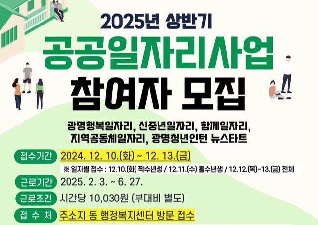 2025년 상반기 공공일자리 사업은 ▲광명행복일자리 ▲신중년일자리▲함께일자리 ▲지역공동체일자리 ▲광명청년인턴 뉴스타트 등 5개 사업으로 저소득 취업 취약계층, 실직자, 미취업 청년 등이 모집 대상이다.
