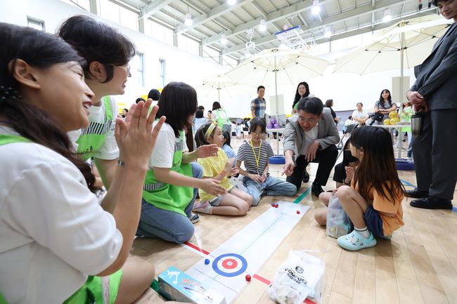 오승록 노원구청장이 학생들과 `플라스틱 디스크 컬링 게임`을 하고 있다.