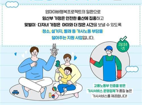 관악구(구청장 박준희)가 임산부·맞벌이·다자녀 가정의 가사노동 부담을 경감해 일과 생활의 균형을 지원하고, 안심하고 아이를 낳을 수 있는 사회분위기를 조성하고자 `서울형 가사서비스` 이용자를 추가 모집한다.