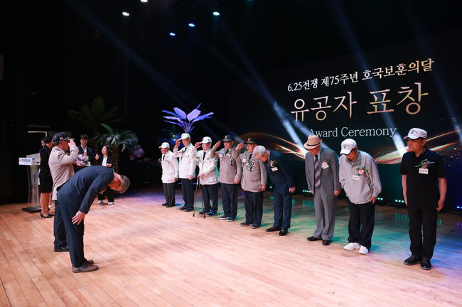지난 6월 호국보훈의 달 기념행사에서 장인홍 구로구청장이 유공자 표창을 수여하고 감사 인사를 전하고 있다.