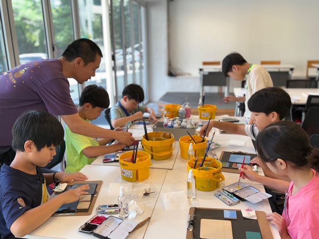 김도희 작가와의 협업에서는 음악과 상상력을 결합한 역동적인 드로잉 활동이 전개됐다. 학생들은 비발디 ‘사계’의 여름 3악장을 들으며 알루미늄 포일 위에 그림을 그리는 등 독창적인 시도를 펼쳤으며, 바닥과 비닐을 캔버스로 활용한 자유로운 페인팅 작업도 이어졌다.