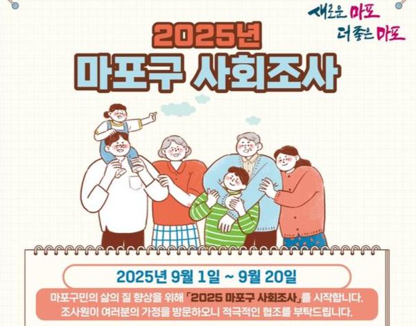 마포구(구청장 박강수)는 구민의 주거·복지 등 생활 실태와 정책 수요를 체계적으로 조사·분석해, 향후 구정 운영의 기초자료로 활용하기 위한 `2025년 마포구 사회조사`를 오는 9월 1일부터 20일까지 실시한다.