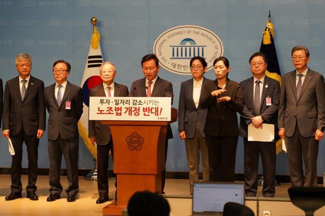 경제6단체장 등이 18일 서울 여의도 국회 소통관에서 노조법 개정 중단 촉구 기자회견을 하고 있다.