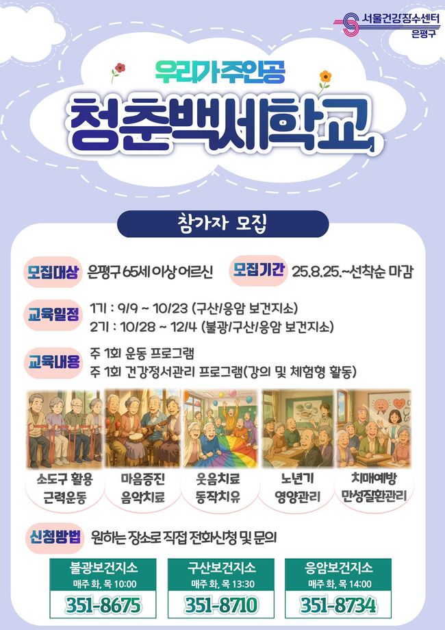 서울 은평구가 지역 어르신들의 건강한 노후와 활발한 사회참여를 지원하기 위해 서울건강장수센터에서 하반기 ‘청춘백세학교’를 개강하고 참가자를 모집한다.