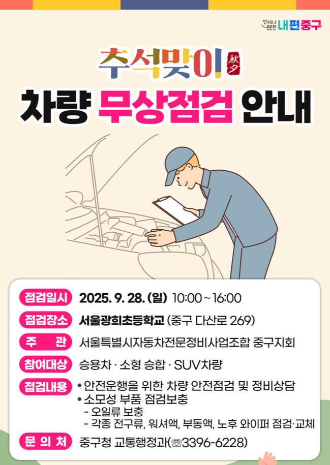 서울 중구는 오는 28일 서울특별시자동차전문정비사업조합 중구지회와 함께 ‘추석맞이 차량 무상 점검’을 진행한다고 밝혔다. 이번 행사는 장거리 주행이 많은 추석 귀성길을 맞아 주민들이 안전하고 즐거운 명절을 보낼 수 있도록 지원하기 위해 마련됐다.