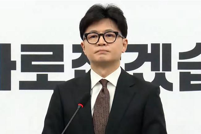 국민의힘 한동훈 대표가 16일 오전 서울 여의도 국회에서 사퇴 발표 기자회견을 하고 있다. 국민의힘 한동훈 대표가 당 대표로 선출된 지 146일 만에 사퇴했다. 한 대표는 이날 국회에서 열린 기자회견에서 "최고위원 사퇴로 최고위원회가 붕괴되어 정상적인 당 대표직 수행이 불가능해졌다"며 사퇴 의사를 밝혔다.