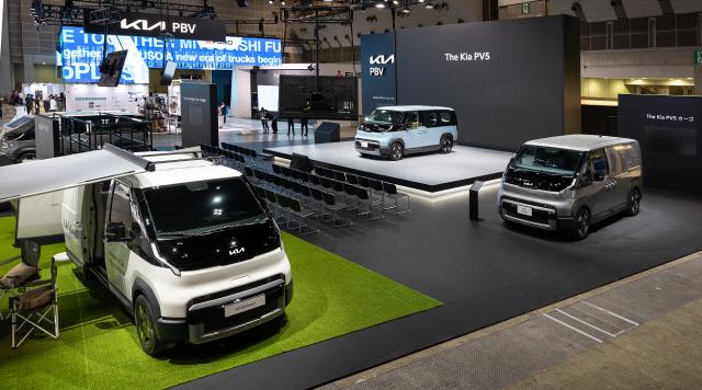 `2025 재팬모빌리티쇼` 기아관 전경. 왼쪽부터 PV5 슈필라움 글로우캐빈, PV5 패신저, PV5 카고