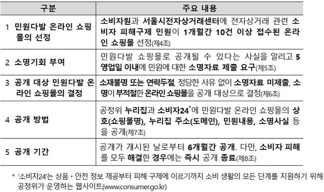 민원다발 쇼핑몰 공개 규정의 주요 내용