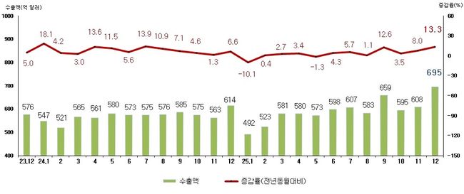 2025년 12월 수출이 반도체 호조에 힘입어 전년 동월 대비 13.3% 증가한 695억 달러를 기록하며 7개월 연속 증가세를 이어갔고, 수입은 4.6% 늘어난 574억 달러로 무역수지는 122억 달러 흑자를 나타냈다.