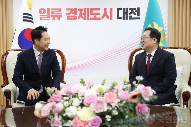 14일 오전 장동혁 당 대표는 대전광역시에 위치한 대전광역시청을 찾아 `대전 · 충남 통합 관련 당 대표-대전시장 정책협의`를 위하여 이장우 대전광역시장을 만났다.