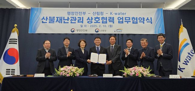 행정안전부, 산림청, 한국수자원공사는 10일 대전광역시 대덕구 한국수자원공사 대청댐지사에서 산불 대응 협력 강화를 위한 3자 업무협약을 체결했다. 협약식에는 홍종완 행정안전부 사회재난실장, 이미라 산림청 차장, 류형주 한국수자원공사 부사장이 참석했다.