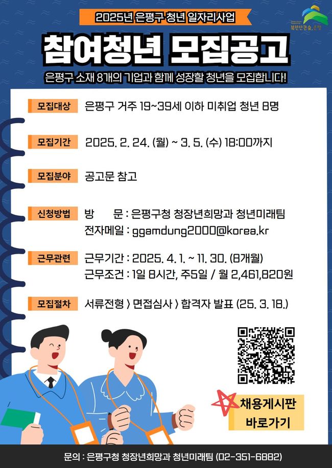 은평구 청년 일자리사업 참여청년 모집공고 포스터