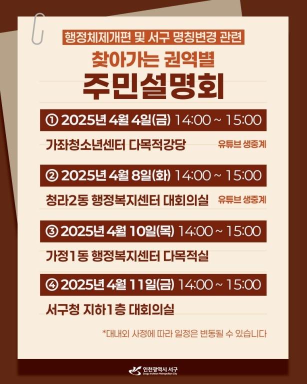 주민설명회는 행정체제개편 방향과 서구 명칭변경 추진사항 전반에 대한 설명 후 현장 참석자들의 질의응답 및 의견수렴 순서로 진행된다.