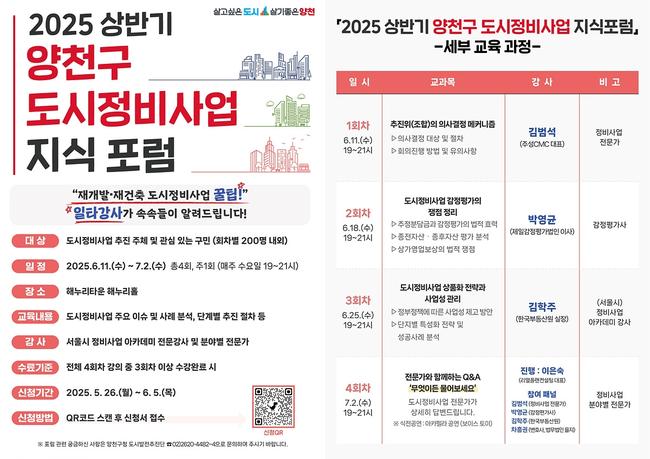 수강을 희망하는 구민은 이달 26일부터 다음 달 5일까지 포스터 내 QR코드 또는 양천구 도시발전추진단으로 전화 신청하면 된다. 구는 추후 교육 과정별 주요 내용이 담긴 강의 영상을 양천구 공식 유튜브 채널 `양천TV`에 게시해 포럼에 참여하지 못한 구민도 꼭 필요한 정보를 얻을 수 있도록 할 방침이다.