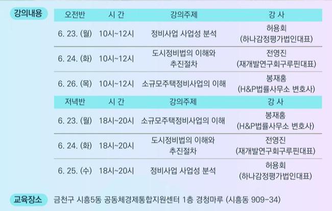 각 분야 전문 강사진이 주거정비사업 추진에 필요한 실무 지식과 관련 법령을 이해하기 쉽게 전달할 예정이다. 주민들의 역량을 강화하고 주민 간 갈등과 분쟁을 예방할 것으로 기대된다.