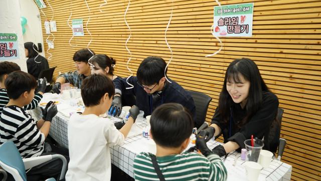 11월 9일 청소년아지트 쉼표의 `원데이 클래스 축제`에서 `슬라임 만들기` 부스를 진행하고 있는 모습