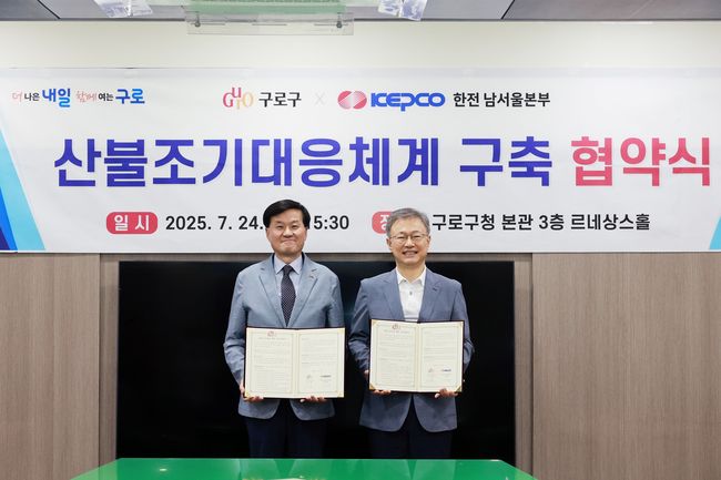 구로구(구청장 장인홍)는 7월 24일 구청 르네상스홀에서 한국전력공사 남서울본부와 ‘산불 조기대응 체계 구축을 위한 업무협약’을 체결했다고 밝혔다.