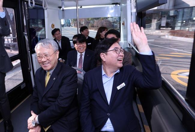 박일하 동작구청장(사진 오른쪽)이 지난 1월 자율주행 마을버스 업무협약 체결 후 자율주행 마을버스를 시승하고 있다.
