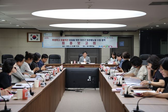 서울 마포구(구청장 박강수)는 25일 오후 4시 30분 마포구청 대회의실에서 「입찰을 위한 마포구 표준 매뉴얼 수립 용역 최종 보고회」를 열고 자치구 최초로 마련한 입찰 표준매뉴얼을 공개했다.
