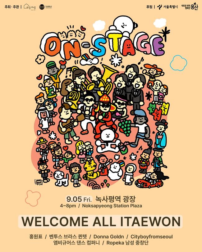 서울 용산구(구청장 박희영)는 오는 9월 5일(토) 오후 4시부터 8시까지 녹사평 광장에서 문화예술축제 `이태원, 다시 무대에 서다(ITAEWON, On-Stage)`를 개최한다. 2,000여명 규모로 열리는 이번 행사는 `Welcome All ITW`를 슬로건으로 내세워, 이태원의 다양성과 포용성을 문화예술로 담아낸다.