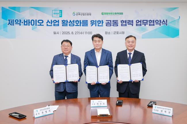 군포시(시장 하은호)는 8월 27일 시청 회의실에서 군포산업진흥원, 청람바이오아카데미와 제약·바이오·헬스케어 산업 활성화 및 지역 인재 양성을 위한 3자 업무협약을 체결했다.