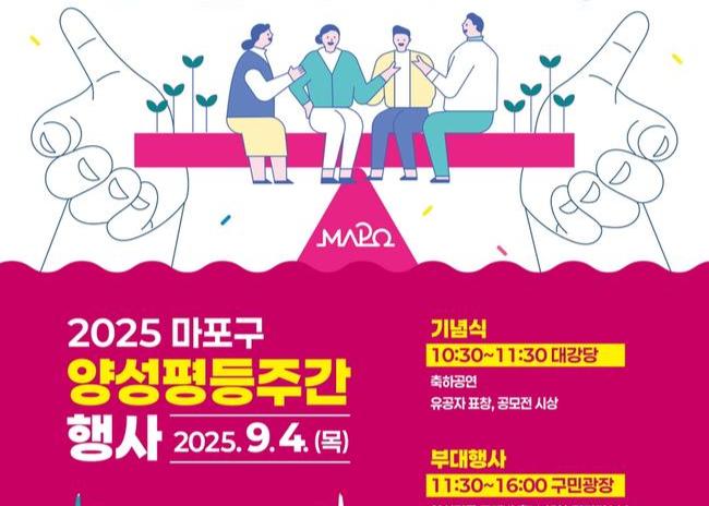 마포구(구청장 박강수)는 9월 1일부터 7일까지 이어지는 양성평등주간을 맞아 양성평등 문화 확산과 인식 제고를 위해 9월 4일 목요일, 마포구청 대강당과 구민광장에서 `제30회 양성평등주간 기념행사`를 개최한다.