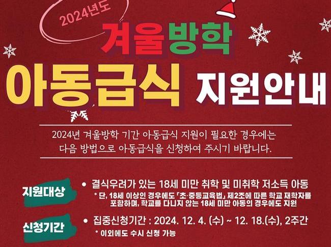 겨울방학 급식 지원 대상은 기준중위소득 60% 이하이면서 보호자의 부재, 질병, 경제적 사정 등을 이유로 가정 내 결식 우려가 있는 18세 미만 아동이며, 내년 2월까지 학교별 방학 기간에 따라 지원한다.