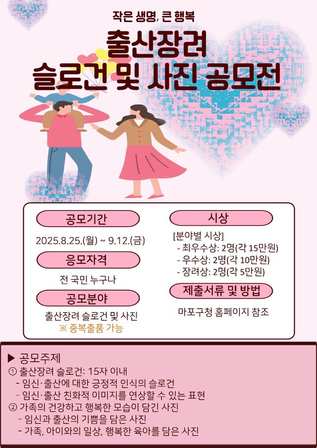 마포구는 임신과 출산에 대한 사회적 관심을 높이고 출산 친화적 분위기 조성을 위해 9월 12일까지 ‘출산장려 슬로건 및 사진 공모전’을 진행한다.