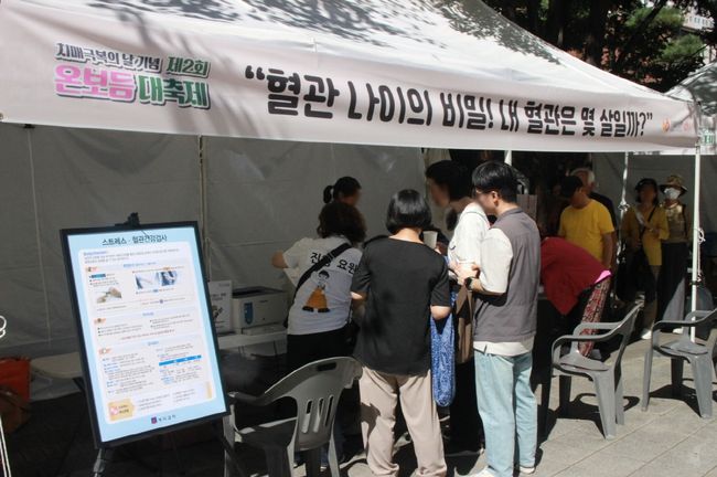작년 제2회 온보듬 대축제, 어르신들이 혈관 나이를 측정하고 있다.