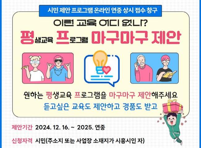 `평생학습 프로그램 마구마구 제안`은 2024년 12월 16일부터 2025년 연말까지 진행되며, 시흥시에 주소나 사업장이 있는 시민이라면 누구나 참여할 수 있다.