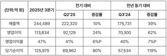 • 매출 24조 4,489억 원·순이익 12조 5,975억 원…창사 이래 최대 분기 실적