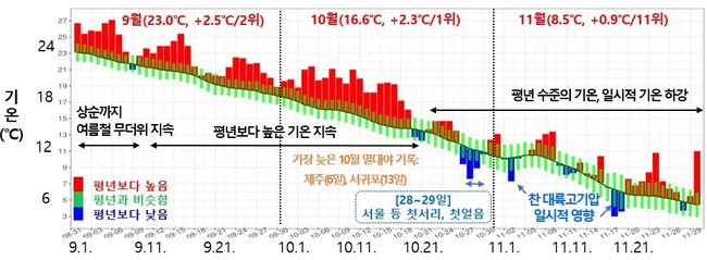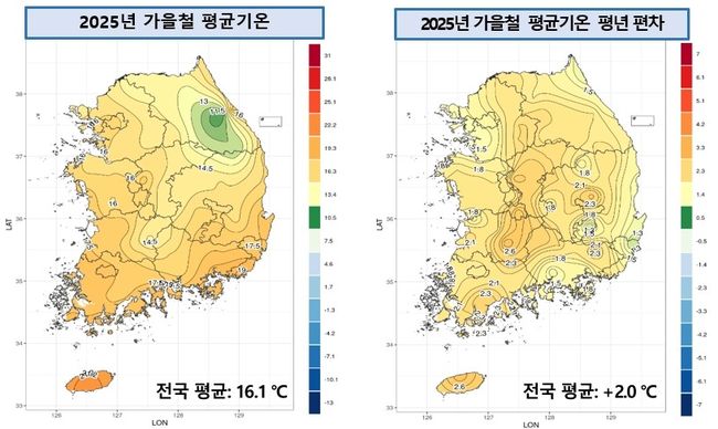 기상청 분석에 따르면 올해 가을철(9∼11월) 전국 평균기온은 16.1℃로 평년보다 2.0℃ 높아 지난해에 이어 역대 두 번째로 높았다. 10월 하순부터 11월 중순 사이 단기간 기온이 떨어지는 구간이 있었지만 전반적으로 높은 기온이 이어졌다. 기상 관측망 확충 이후 53년간 통계를 기준으로 평균기온은 2024년(16.8℃)에 이어 두 번째 기록이다.
