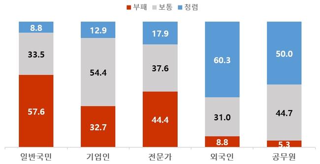 전년과 비교하면 기업인(43.6%→32.7%), 전문가(53.8%→44.4%), 공무원(12.8%→5.3%), 외국인(14.5%→8.8%) 등 일반국민을 제외한 모든 집단에서 ‘우리 사회가 부패하다’는 인식이 개선됐다. 반면 일반국민은 57.1%에서 57.6%로 0.5%p 증가했다.