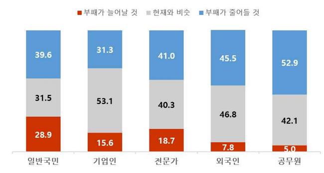 향후 부패수준 전망에서도 ‘현재보다 부패가 줄어들 것’이라는 응답이 전 조사대상에서 큰 폭으로 늘었다. 일반국민은 39.6%(14.7%p↑), 기업인 31.3%(14.0%p↑), 전문가 41.0%(19.5%p↑), 외국인 45.5%(17.0%p↑), 공무원 52.9%(12.5%p↑)로 나타났다.