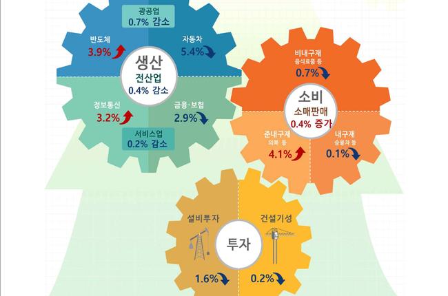 소비 동향에서는 소매판매가 의복 등 준내구재 판매 증가로 전월 대비 0.4% 상승했다. 하지만 전년 동월 대비로는 승용차, 화장품 등의 판매 감소로 인해 1.9% 줄었다.