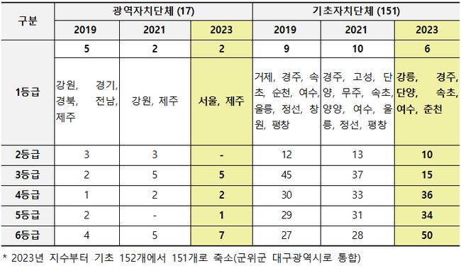 • 서울과 제주 등 광역 2곳, 강릉과 춘천 등 기초 6곳 1등급 선정