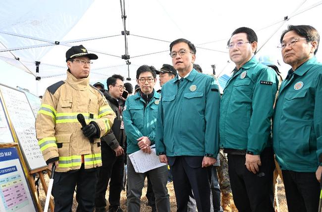 최상목 대통령 권한대행 부총리 겸 기획재정부 장관이 29일 전남 무안공항 항공기 사고 현장을 방문, 관계자의 상황설명을 듣고 "가용한 모든 인력, 장비를 총 동원해 인력구조에 총력을 다해달라.` 당부했다.