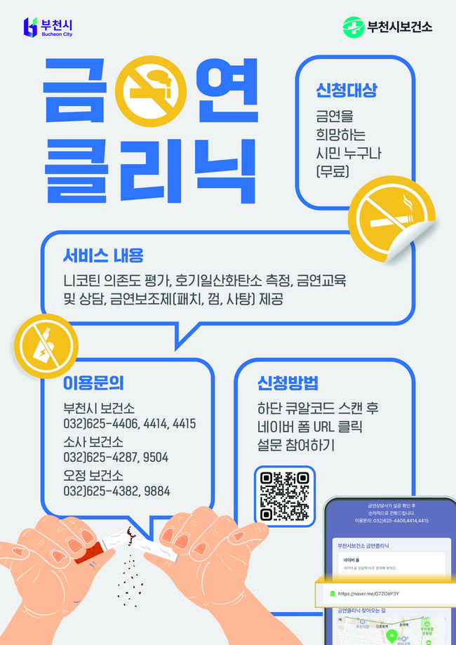 부천시는 흡연자의 금연 성공을 위한 금연 클리닉을 운영하고 있다. 금연 클리닉은 흡연자에게 금연 지원 서비스를 제공하여 금연 실천을 유도하고 건강증진을 도모하기 위하여 운영되고 있다.