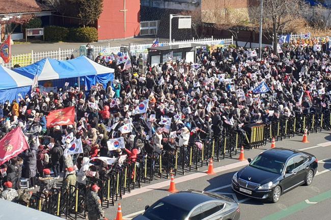 이들은 태극기와 성조기를 흔들며, 인도에는 "헌정질서를 행동으로 지켜주셔서 감사합니다" 등의 화환을 설치했다.